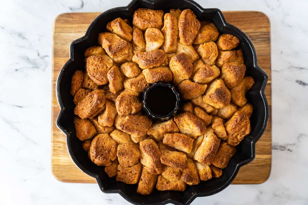 If your Monkey Bread falls apart after flipping, this is typically because the pan wasn't greased well enough, or it wasn't baked all the way through.