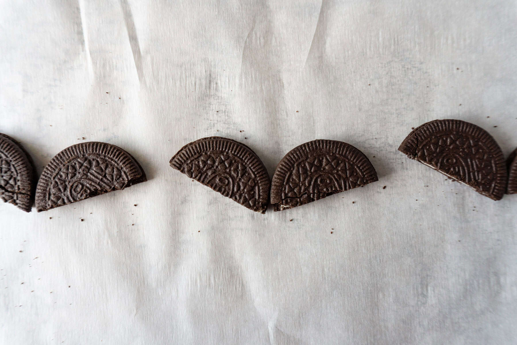 - Step 8: Break Thin Oreos in half and set on parchment paper.