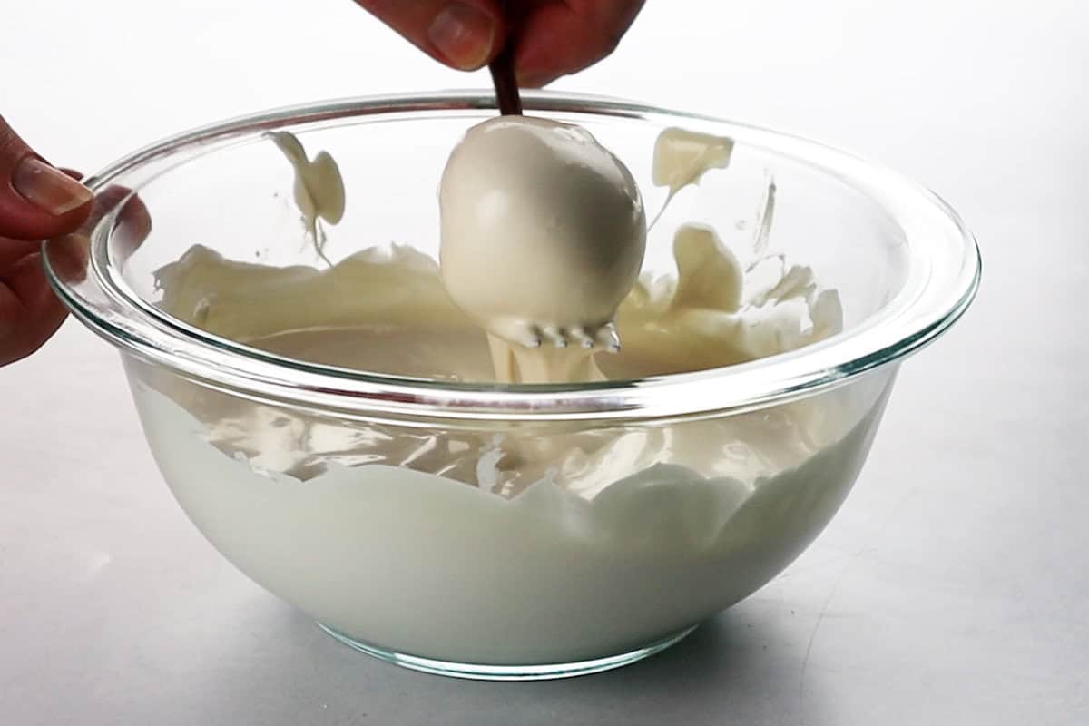- Step 8: Use a fork to scoop the cake ball out of the melted chocolate then tap against the bowl to get the extra chocolate off.