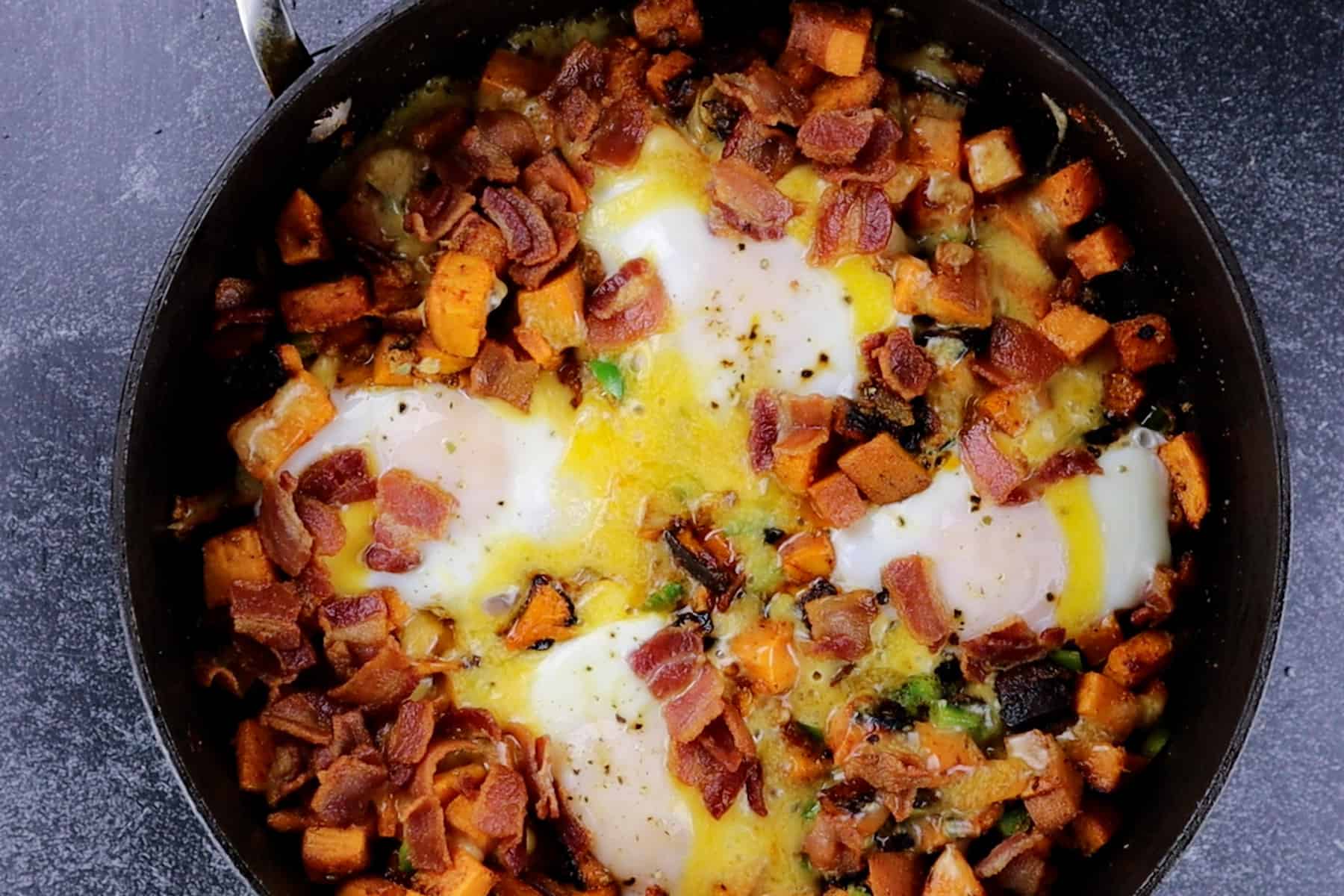 I love a good sweet potato and eggs breakfast skillet! This sweet potato hash is full of tasty sweet potatoes, eggs, cheese, bacon, lots of flavor!