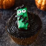 Press Kit Kats upside down into a frosted cupcake. Using a Wilton #104 petal tip for the green buttercream, cover the Kit Kat in a thin layer of frosting. Gently press on the candy eyes, then use a Wilton #3 writing tip and black buttercream to add hair and scars.