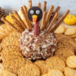 Roll the ball in chopped pecans and set it on the plate or tray you will serve it on. Add pretzel rods as feathers. I recommend breaking rods in half and layering taller and shorter ones together. Then place your meat stick with the head attached in the cheese ball as the neck. My meat stick was a little too long, so I tore off a bit at the end to make it shorter.